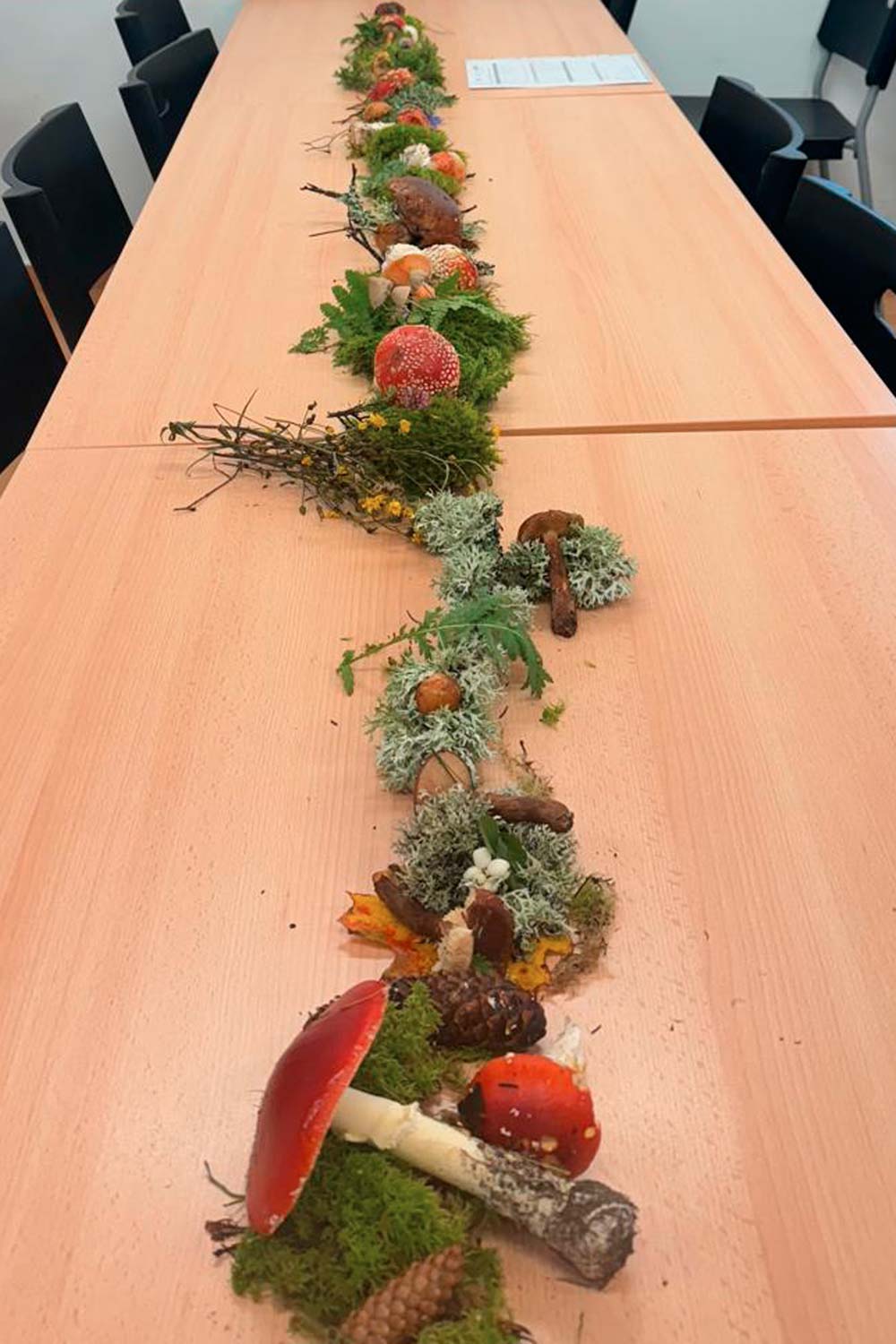 Po zahájení a přivítání našimi prtojektovými partnery a imbisem s výborným upečeným moučníkem se šlo na malou procházku k perninkovému rašeliništi obnovenémuj po těžbě rašeliny. Bohužel hustá mlha nám nedovolia pohled z výhledové platformy na okolí, ale dodala této krajině zvláštního rázu. Na zpáteční cestě se sbíraly různé přírodní materiály, které byly pak pužity pro stolní dekoraci.