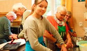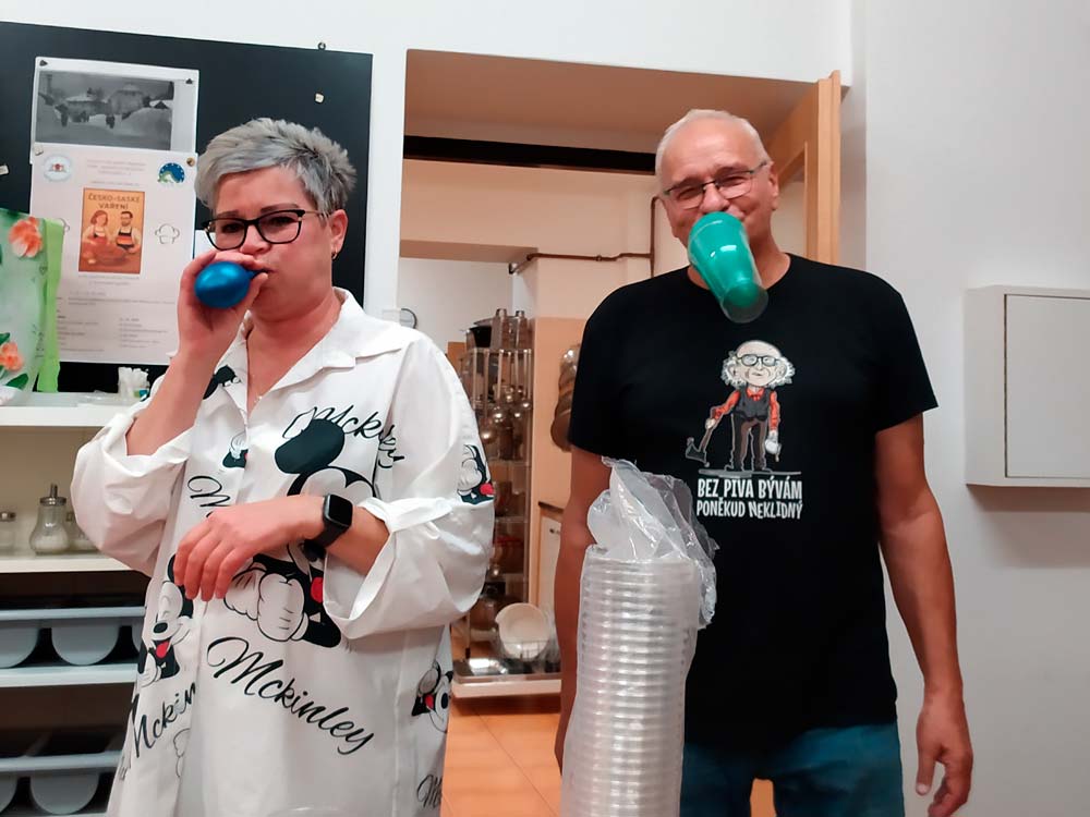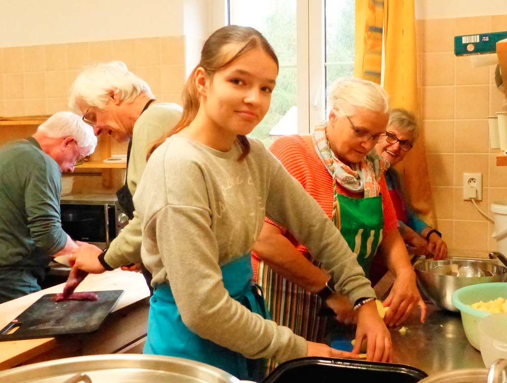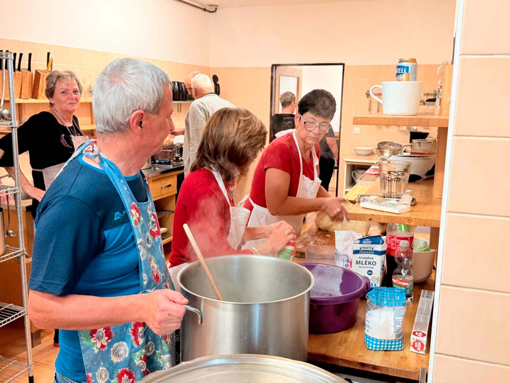 Die Aufgabe war diesmal, verschiedene Gulasch-Varianten zu kochen. Unser Verein entschied sich für einen Kesselgulasch. Unter der Leitung von Helga Mothes wurde geschält, geschnitten und alles zum Kochen gebracht. Unterstützung hatte sie reichlich. Unsere tschechischen Freunde bereiteten einen Szegediner und einen traditionellen Gulasch nach Landesart. So ganz nebenbei entstanden noch weitere Köstlichkeiten, leckere Kuchen und Gebäck.