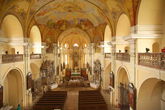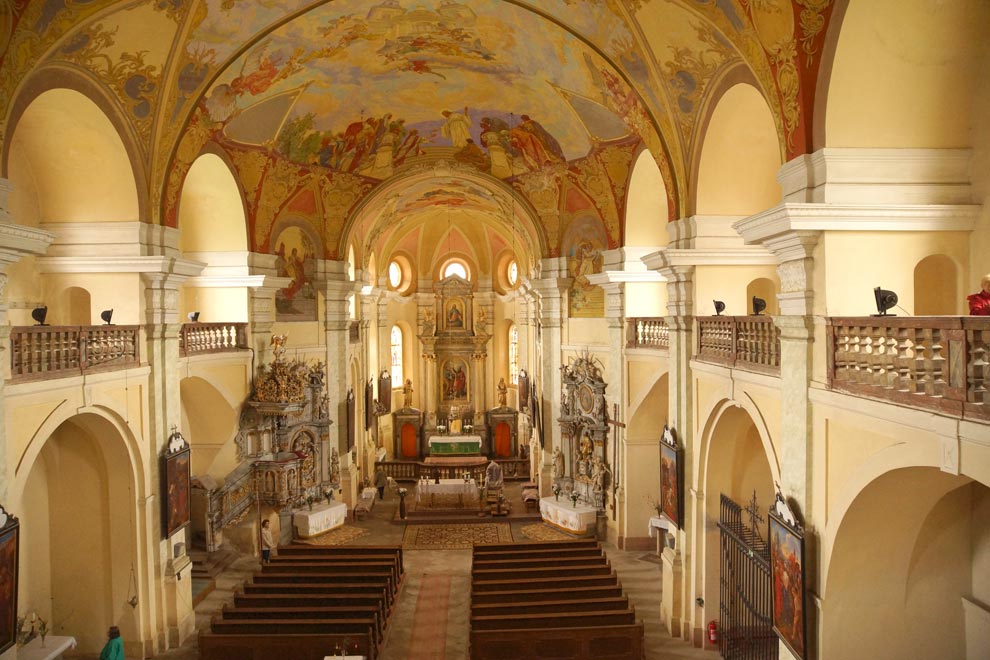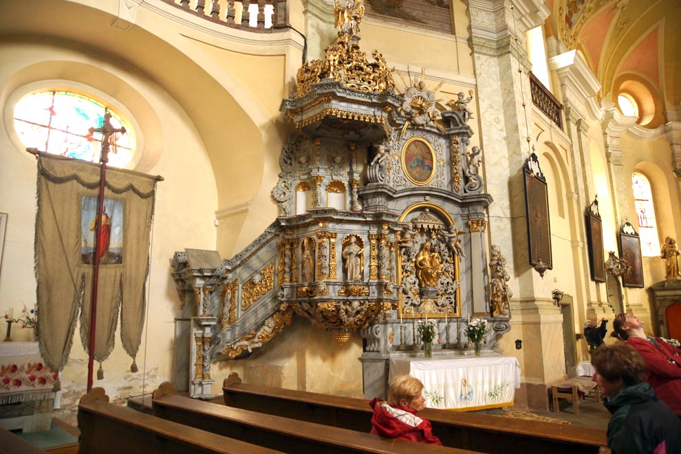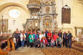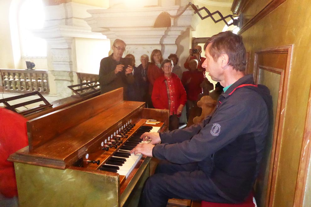 Abschließend besuchten wir das kleine Städtchen Mnichov (Einsiedel). Einst wurde das in der Umgegend gefundene Serpentinit hier handwerklich bearbeitet. Von der einstigen Kunstfertigkeit der Bewohner konnten wir uns in der Kirche überzeugen. Besonders der Taufstein war sehenswert. Petr Rojik zog es regelrecht an die kleine Orgel der Kirche. Da ein tschechischer Wanderfreund auch die Kunst des Tretens des Blasebalges mit Füßen beherrschte, stand einem kleinen Konzert nichts im Wege.