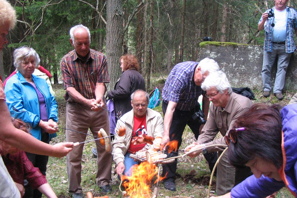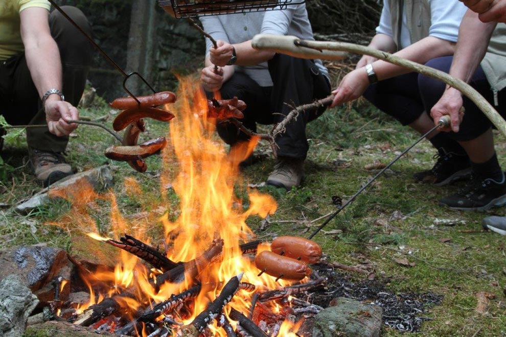 Inzwischen war die Mittagszeit herangerückt und ein Geologe weiß natürlich auch, wo es eine köstliche Quelle gibt. An einer Mineralquelle mit hohem Magnesiumgehalt war unser nächster Halt. Alle Teilnehmer füllten ihre Becher und Flaschen. Bald knisterte in der Nähe ein Feuerchen, auf dem die mitgebrachten tschechischen Špekáčky und deutschen Bratwürste knusprig braun gegrillt wurden.