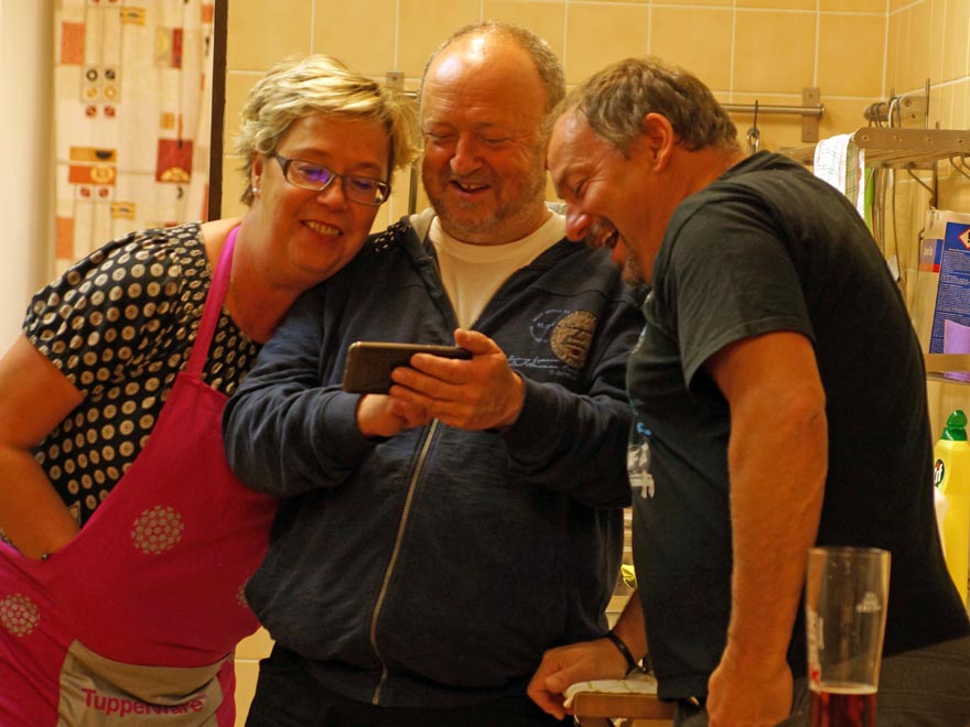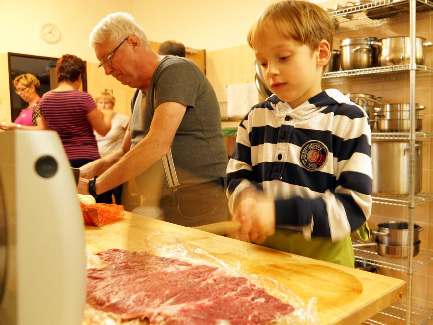 Nach dem Mittagssen begannen wir endlich, gemeinsam ein hervorragendes 4-Gänge-Menü zu zaubern. Es war eine tolle Gemeinschaftsarbeit, bestens vorbereitet von unserem Aberthamer Partnern. Aber neben Kartoffeln schälen, Fleisch klopfen, bruzeln und kochen war immer Gelegenheit für ein Späßchen oder eine nette Unterhaltung.