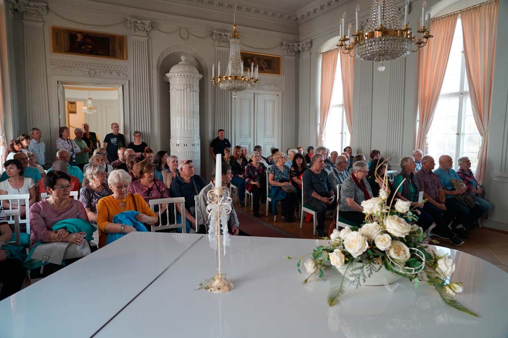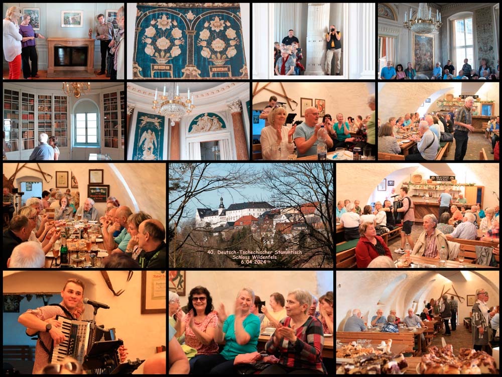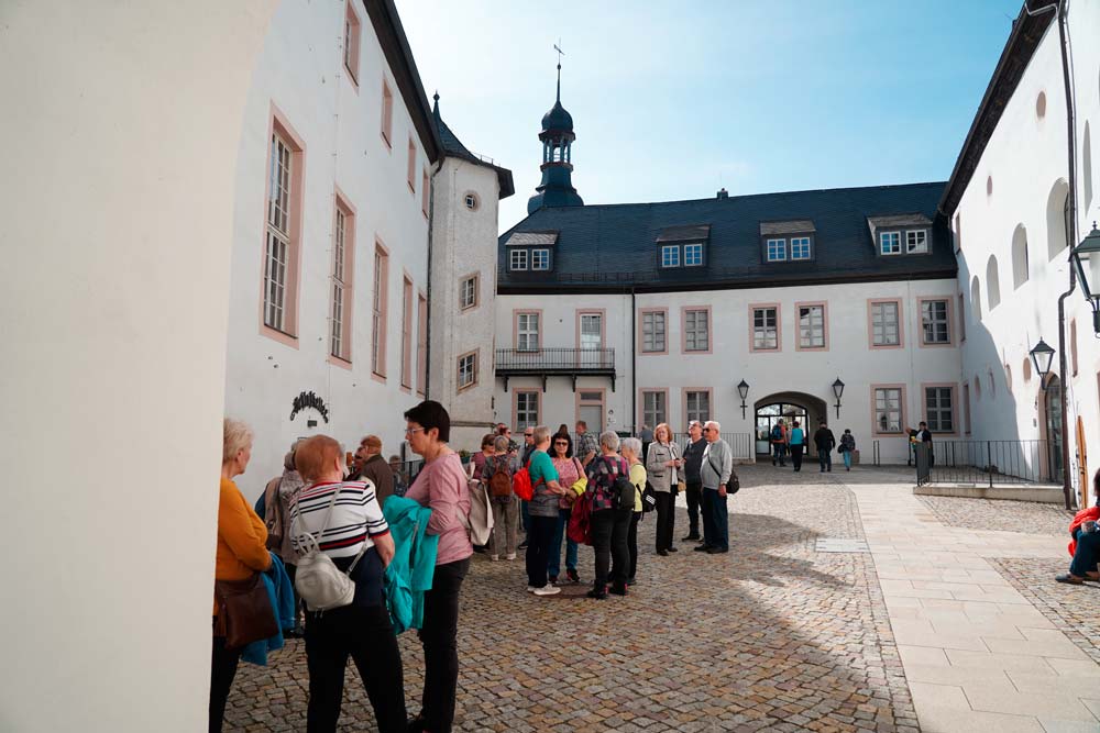 Nach der teilweise langen Anreise, insbesondere der Teilnehmer aus Kraslice und Klingenthal, starteten wir mit Kaffee und Kuchen im Schlosskeller. Dabei wurden bereits erste Neuigkeiten ausgetauscht. Viele besuchten dann den imposanten Schlossgarten, ehe wir uns im Schloss zu einem sehr interessanten Vortrag und einem anschließenden Rundgang durch das Schloss trafen. Alle waren begeistert und auch beeindruckt von der Leistung und dem Engagement des dortigen Vereins „Freundeskreis Schloss Wildenfels e. V.“, der das Schloss wieder in ein Schmuckstück verwandelt hat.