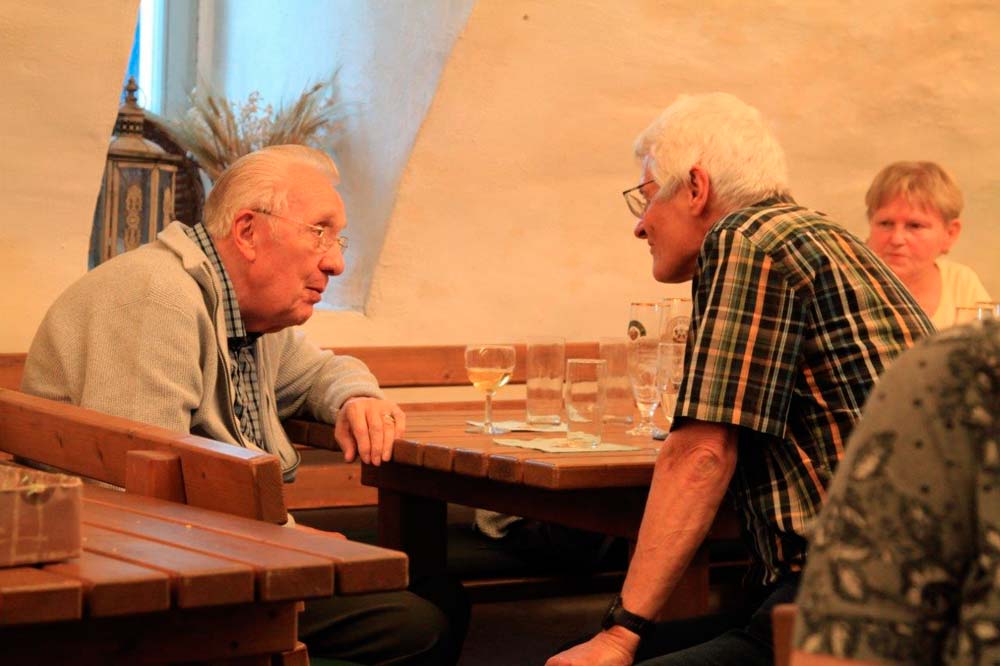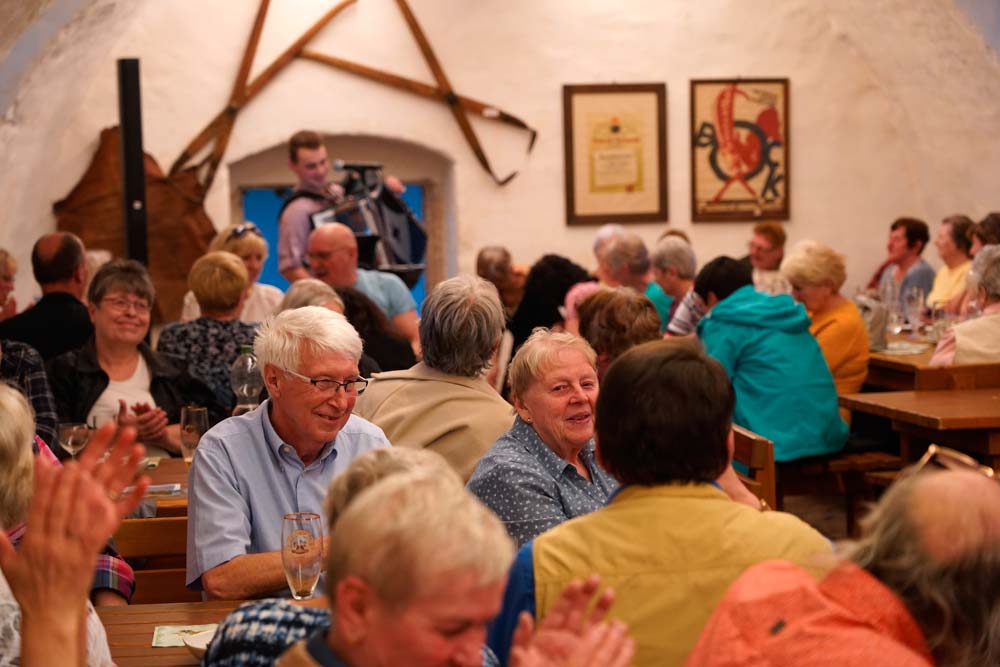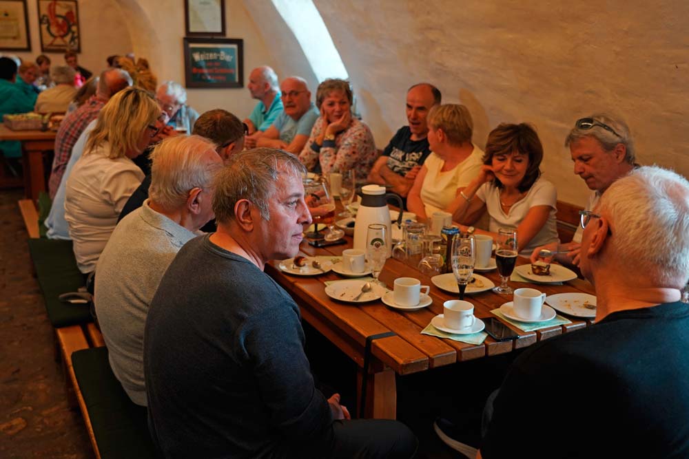 Anschließend war im Schlosskeller gute Gelegenheit, sich über das Erlebte auszutauschen und dabei auch die Sprachfähigkeit in der jeweils anderen Sprache zu testen. In einer geselligen Runde klang dann dieser deutsch-tschechische Stammtisch bei Musik und Gesang und einem ausgiebigen Abendessen aus.