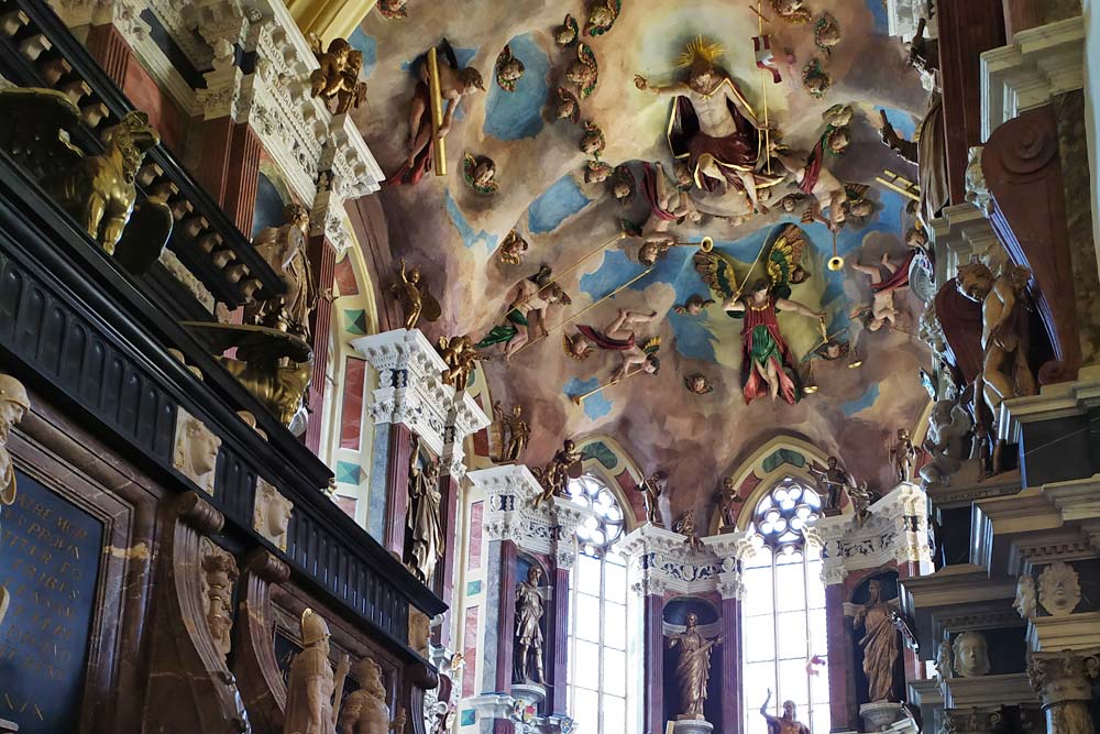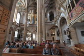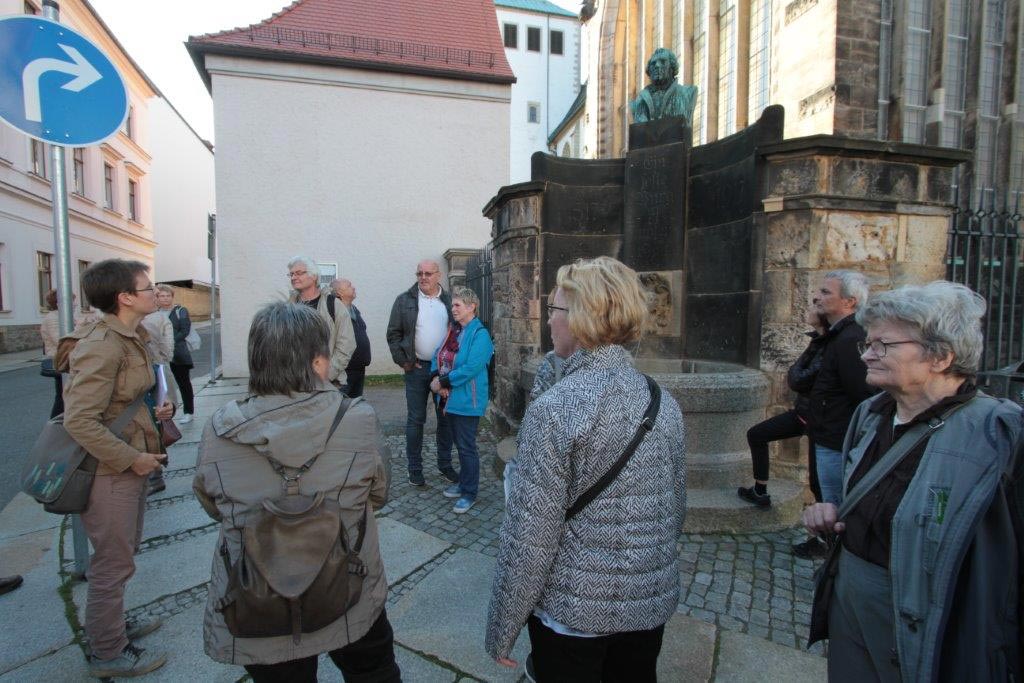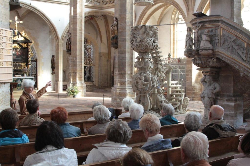 Um 15.00 Uhr waren wir zur Besichtigung in den Freiberger Dom St. Marien eingeladen. Zu Beginn hörten wir zwei Stücke, auf der großen Sibermannorgel. Besonders die Musik von J. S. Bach füllte den Dom mit wunderbaren Klängen aus. Unsere Führerin erklärte uns die wichtigsten Kunstwerke, die Symbolik von Bergmannskanzel und Tulpenkanzel, die reich verzierte Begräbniskapelle, die weltberühmte Goldenen Pforte und den restaurierten Kreuzgang.