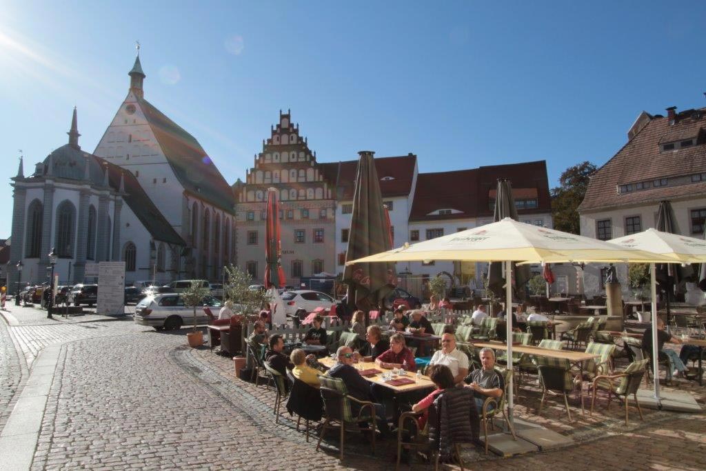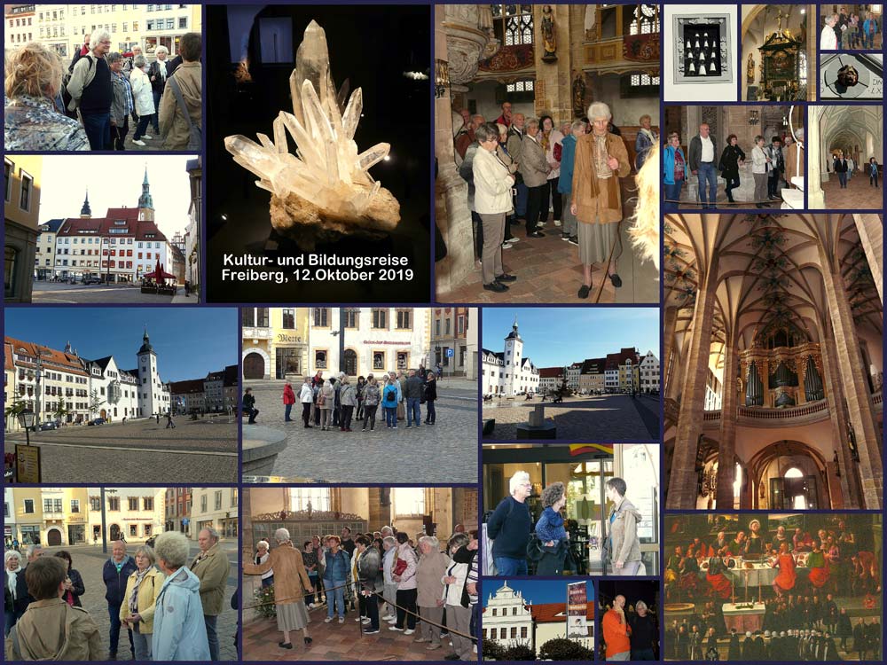Am 12. Oktober 2019 starteten 60 Teilnehmer aus Abertham/Abertamy, Schwarzenberg, Aue und Lößnitz zu einer Exkursion nach Freiberg. Gegen 9.30 Uhr kamen wir vor dem Schloss Freudenstein bei herrlichem Sonnenschein an.