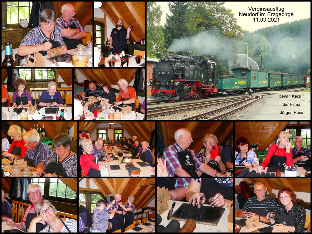 Am 11. November 2021 konnten sich die Mitglieder unseres Vereins nach langer Zeit endlich wieder einmal treffen. Bernd Mothes hatte in bewährter Weise den Besuch in der Weihrichkarzle-Werkstatt Huß (https://huss-weihrichkarzle.de) in Neudorf/Sehma organisiert. In der Gaststätte „Bimmelbah“ in der Nähe des Bahnhofes konnten wir uns erst einmal stärken, den Platzregen abwarten und uns gegenseitig die Neuigkeiten der vergangenen eineinhalb Jahre erzählen. Für 13.30 Uhr waren für uns in der Schauwerkstatt Plätze reserviert. Nach der Einführung versuchte jeder etwa 60 Karzln mit eigenen Händen zu formen. Die Formgebung war künstlerisch anspruchsvoll. Aber jeder konnte endlich seine 60 Unikate mit geraden oder schiefen Mützen mit nach Hause nehmen. Nach dem Händewaschen mit Kernseife und kaltem Wasser (nur so werden die kohlschwarzen Hände wieder porentief rein) konnten wir unser Treffen in der Löffelstube bei Kaffee und Kuchen gutgelaunt beenden. Wichtige erzgebirgische Wörter wurden dabei diskutiert, wie zum Beispiel: Karzln, Frieslich, Runksen, Eigeschnietne oder …