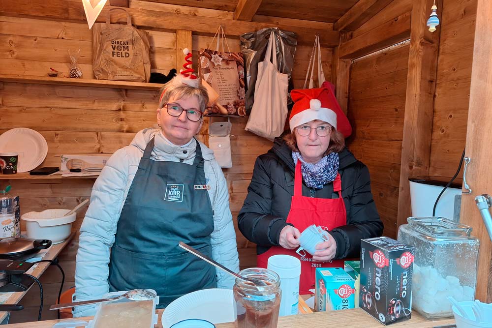 Bis 10 Uhr war unser Stand komplett ausgestattet und geschmückt. Diesmal erhielten alle Beteiligten neue kleine Holzhütten. Unser Angebot bestand aus Glühwein, Kaffe und Tee, frischen Waffeln sowie weihnachtlichem Gebäck.